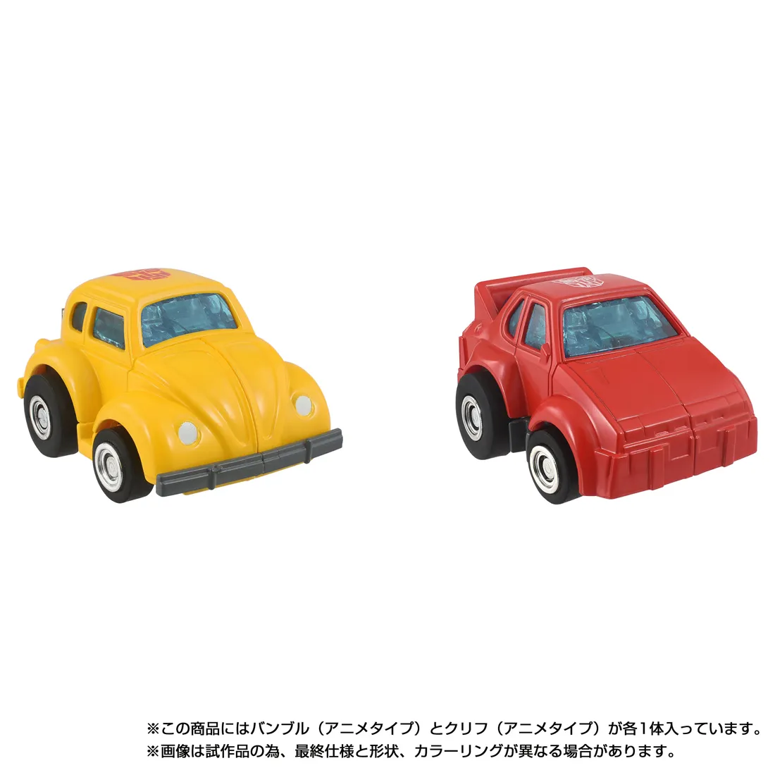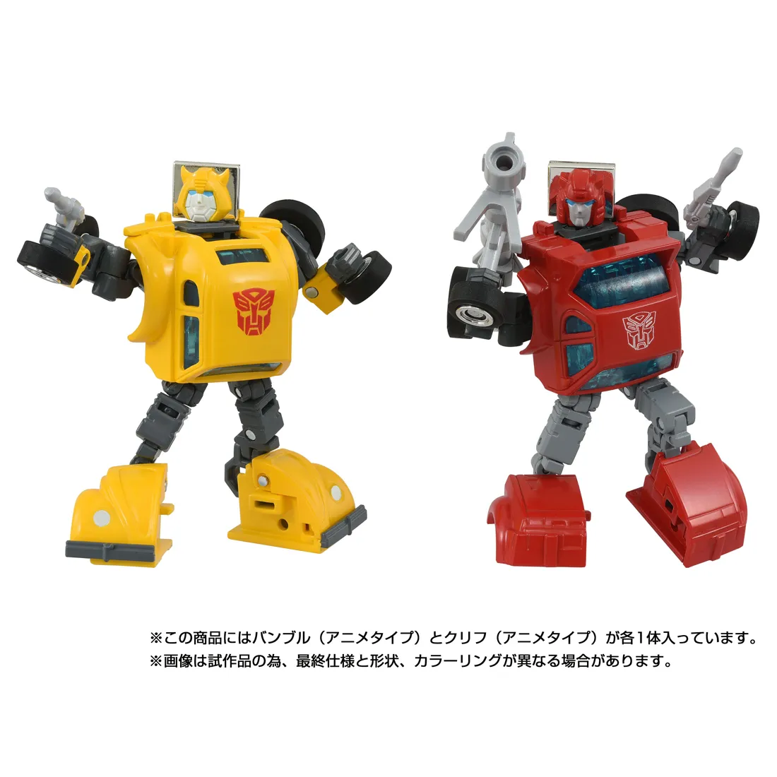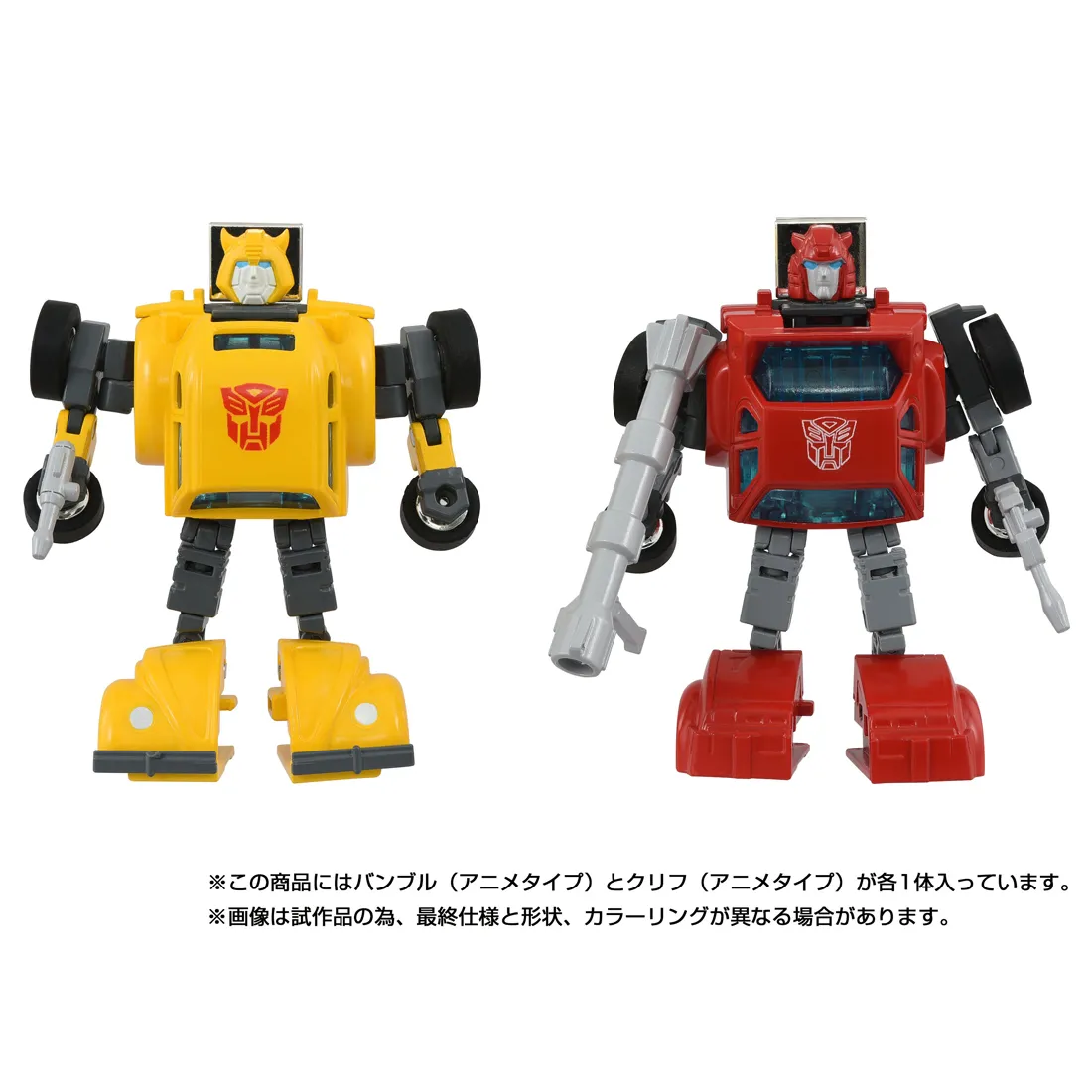 ミッシングリンクC-03バンブル・C-04クリフとして2024年に登場した商品を一部造形を変更、カラーリングをアニメイメージに変更してセットにした商品です。バンブルの頭部はアニメをイメージした新規造形に変更。ウィンドウ部分を通常版のブラックからクリアブルー成型に変更し、より密度感を高めています。一部にダイキャストを使用した構成はそのままに、可動式の各部関節で自由にポージングを付けることが可能です。バンブルは、フォルクスワーゲン・ビートルに変形し、カーモードはフォルクスワーゲン社より正規ライセンスを取得して商品化しております。バンブルにはレーザーガン、クリフには光子ライフルが付属。それぞれカーモードでは内部に収納することができます。またクリフにはアニメで印象的なバズーカ砲も付属。本体にはおなじみ「シークレットエンブレム」も貼付、指で温めると軍団マークが現れます。ロボット背面には別売りのスタンド用ジョイント穴があり、アクションポーズで飾ることが可能。パッケージイラストは当時をイメージしたもので、同イラストをあしらったコレクションカードも2枚付属します。(ロボットモードの全高:各76mm)