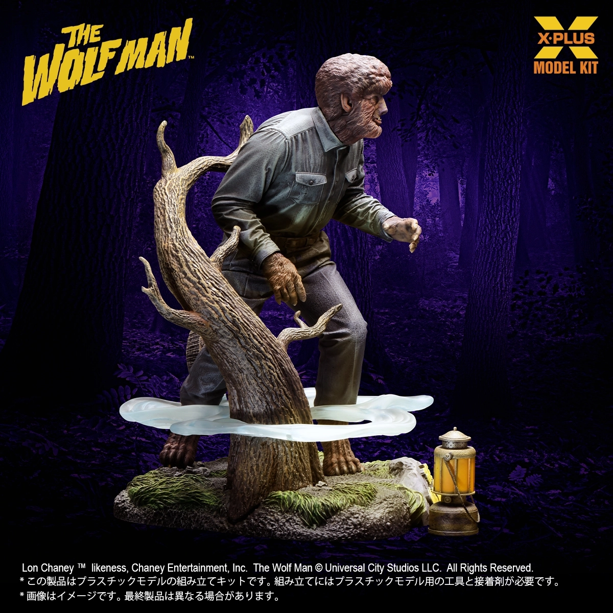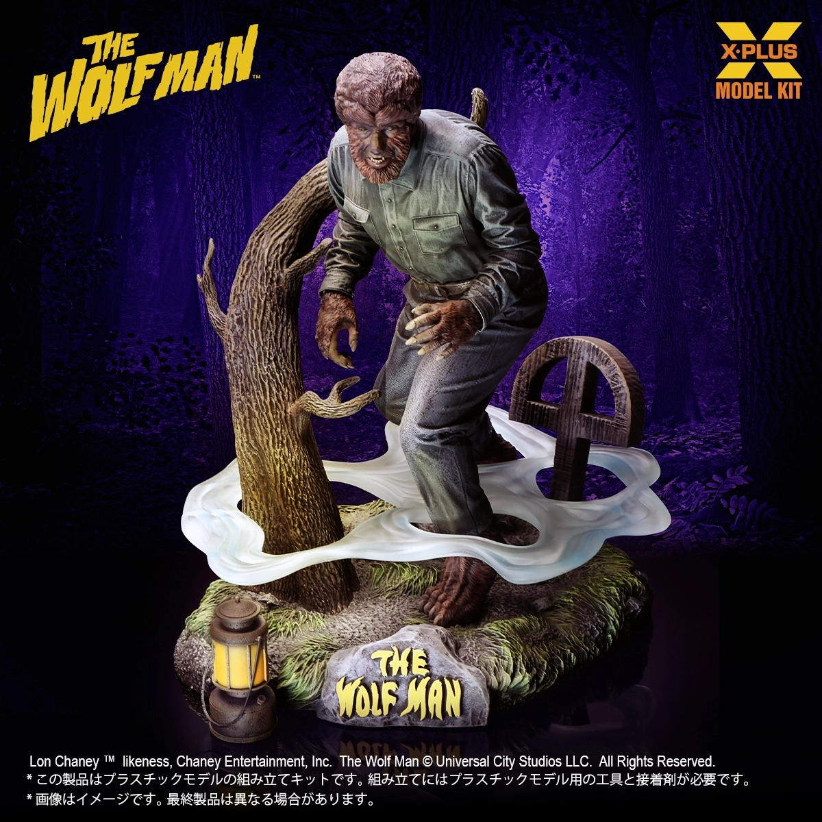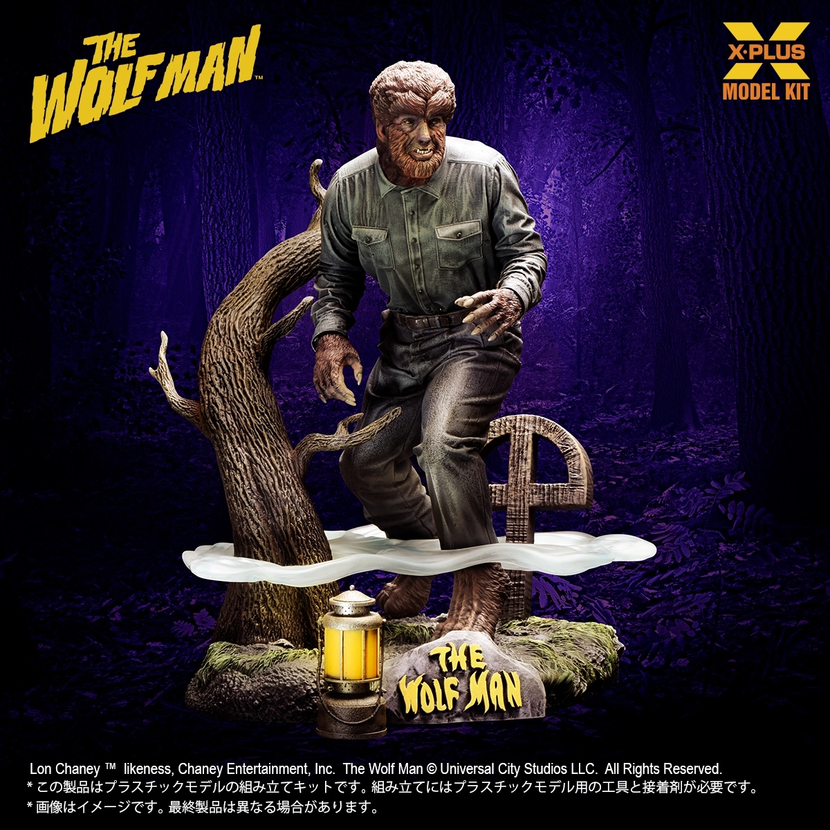 ユニバーサル・モンスターズのモデルキットシリーズに1941年公開の映画『The WOLF MAN』から狼男が登場です。特徴的なプロポーションやポーズの再現をはじめ、ロン・チェイニー・ジュニア氏の演技が光る目線や細やかな獣の体毛の造形に注力しました。そして劇中でも印象深い演出だった立ち込める「霧」を透明パーツで立体化。他にもランタンや墓標などが付属し雰囲気を更に盛り上げます。
