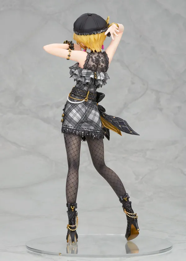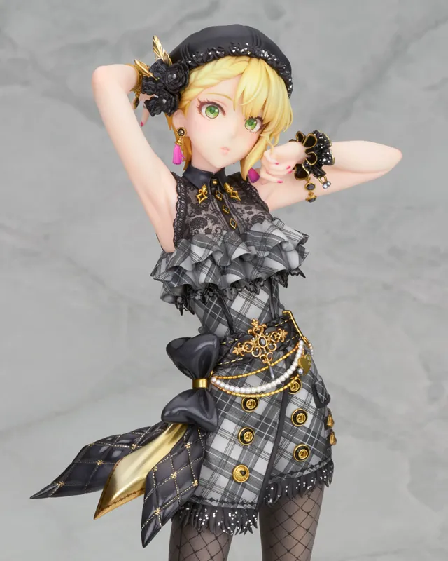 緩やかなS字を描いたポージングが艶やかな印象を与え、肌とモノトーン調の衣装とのコントラストが目を惹く仕上がりです。フリルやアクセサリー、ショートブーツなども丁寧に造形。チェック柄やレース模様も細部まで再現され、衣装の素材感によって使い分けられたツヤ加減、要所に施されたゴールド、ラメの彩色がシックで華やかな雰囲気を演出します。ストッキングの質感表現もご注目ください。