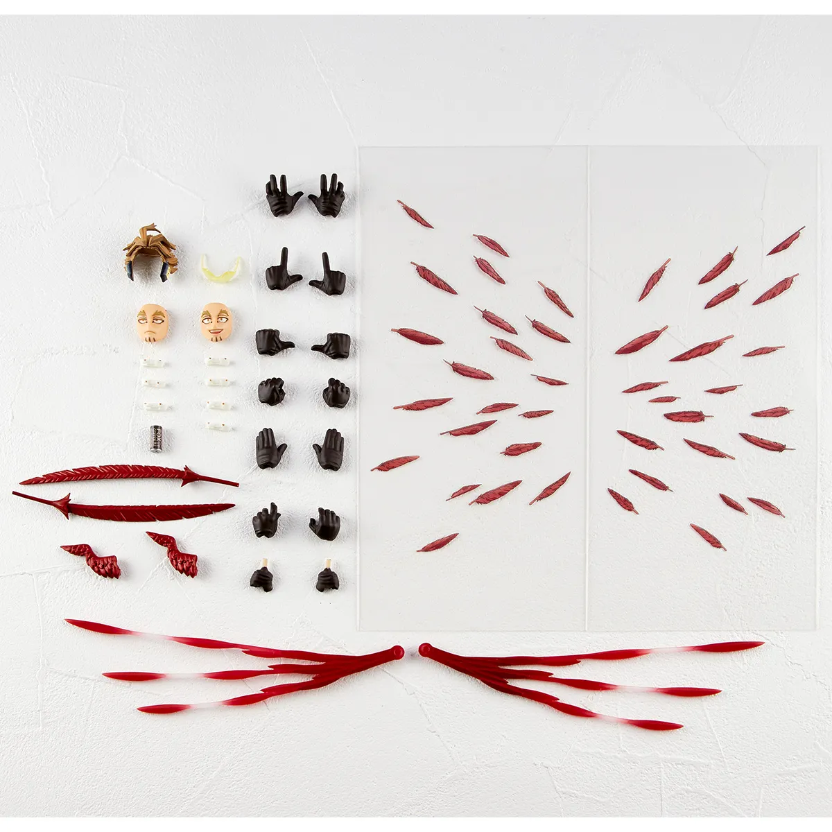 「剛翼」の発射エフェクトパーツは、コミック風に軌跡を引いて飛ぶ羽根を造形により表現。さらに、刀のように手持ち武器として使う大型の羽根、周囲に浮かべた羽根が描かれたエフェクトシート、全ての羽根を発射した後に残る雨覆羽など、幅広い“個性”の応用を再現するパーツが付属します。