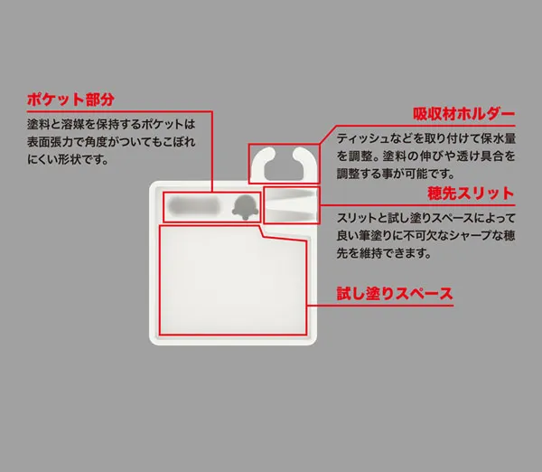 ティッシュペーパーなどの吸水材を取りつけるホルダーで、“塗料の伸び”に影響する筆の保水量を細かく調整をする事ができます。