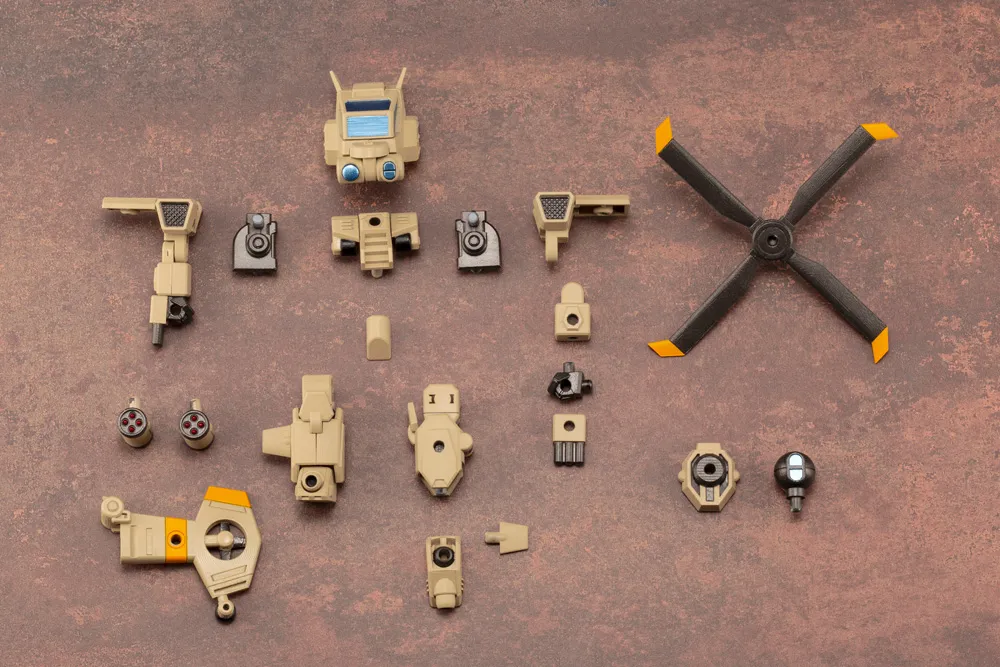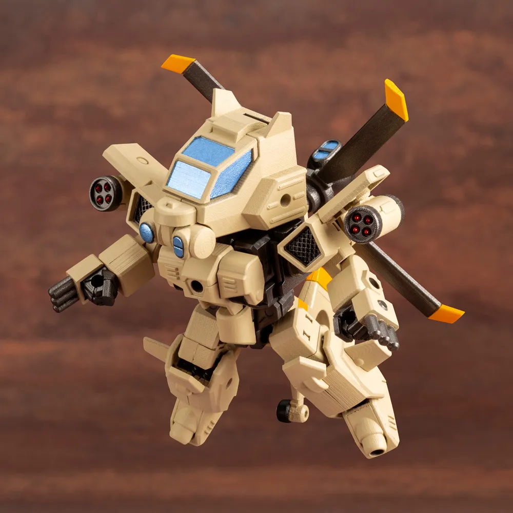 ■3mmジョイント規格で組み立てるコアパーツはそのまま可変式のフレームとして使用する事ができ、デフォルメロボット形態から戦闘ヘリコプター形態へと変形する事が可能です。