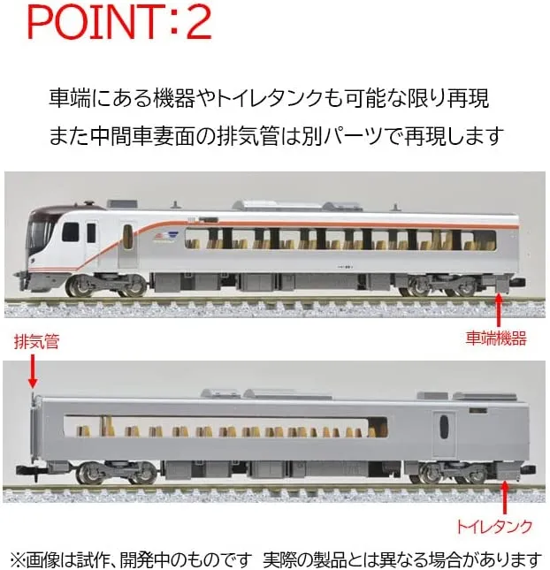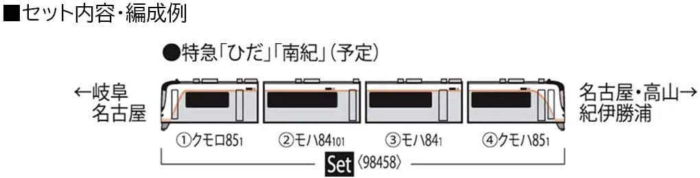 特急南紀・ひだ用新型車両HC85系試験走行車を製品化。HC85系ハイブリッド車を新規製作で再現。JR東海承認申請中。車番・JRマーク・「HYBRID」ロゴは印刷済み。カラーシート採用。側面グリーンガラスを再現。ヘッド・テールライトは常点灯基板装備、ON-OFFスイッチ付。ヘッド・テールライトは白色LEDによる点灯。先頭車運転台側はTNカプラー (SP)採用。